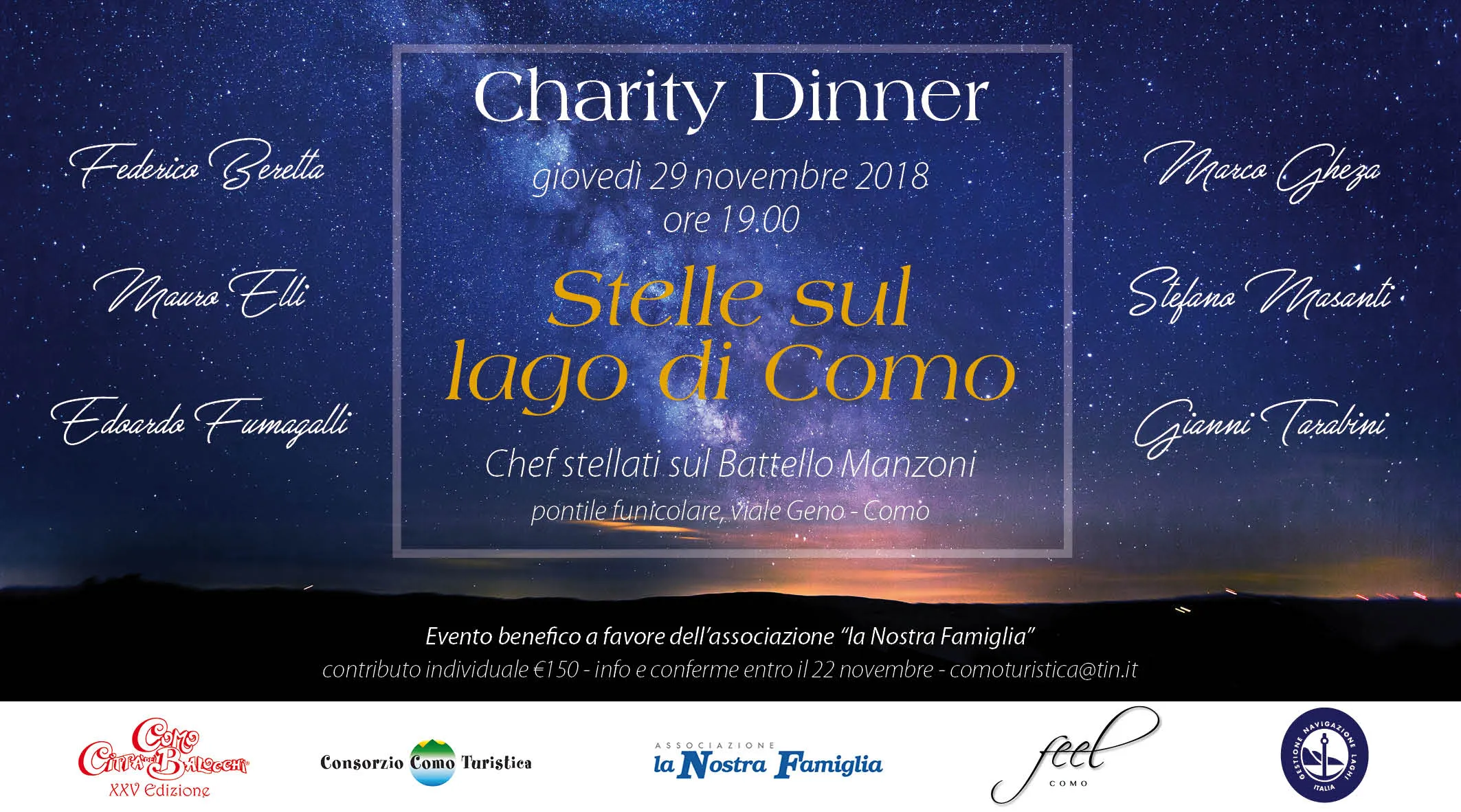 "Amici di Como" e la Città dei Balocchi organizzano il 29 novembre un evento culinario all’insegna della solidarietà: “Stelle sul lago di Como” è infatti un esclusivo Charity Dinner a bordo del Battello Manzoni, per sostenere La Nostra Famiglia nella costruzione di un nuovo centro di riabilitazione.