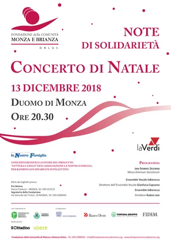 Giovedì 13 dicembre alle 20.30, nella suggestiva cornice del Duomo di Monza, si rinnova il tradizionale appuntamento con il Concerto benefico «Note di Solidarietà» organizzato dalla Fondazione della Comunità di Monza e Brianza Onlus in collaborazione con la Fondazione Orchestra Sinfonica e Coro Sinfonico di Milano Giuseppe Verdi. Quest’anno l'Ensemble LaBarocca interpreterà la Missa Omnium Sanctorum di Zelenca, diretta dal maestro Ruben Jais.