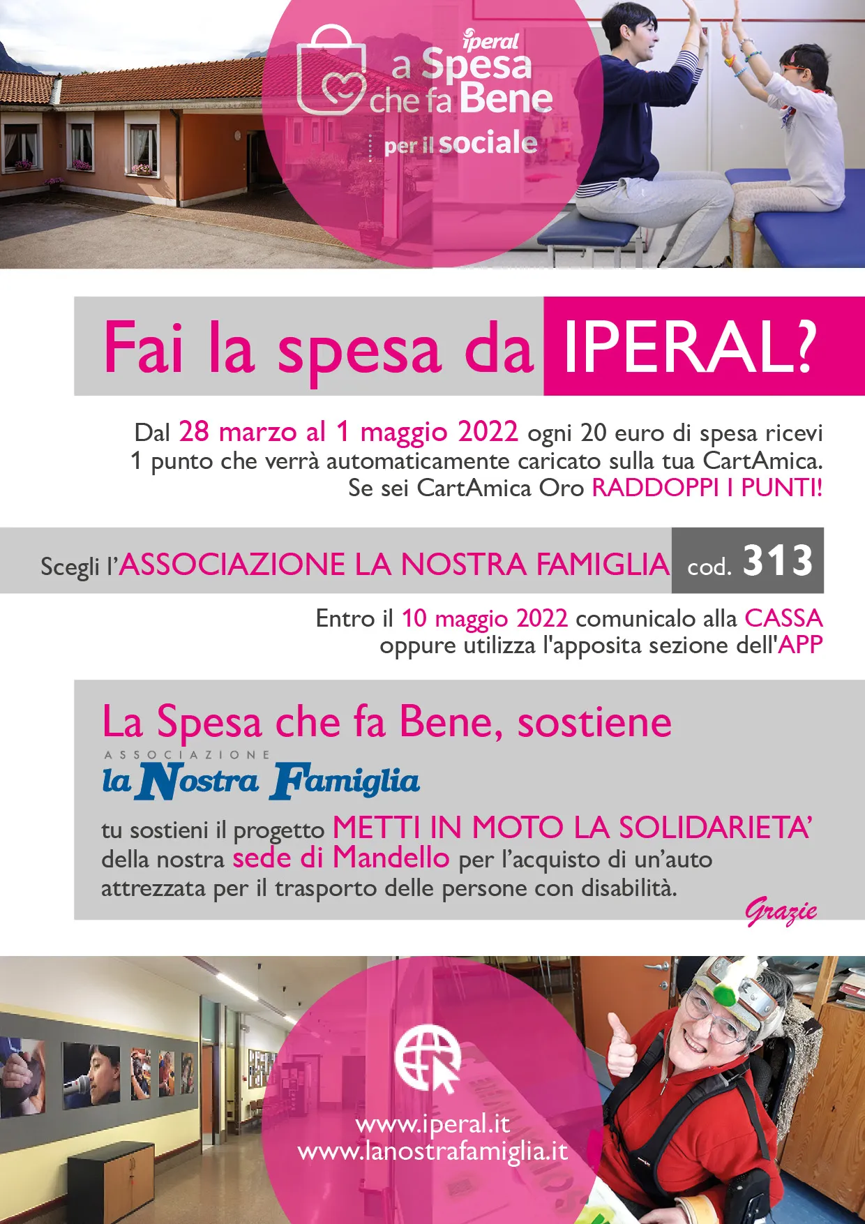 Dal 28 marzo al 1 maggio i clienti Iperal dei punti vendita presenti nelle province di Como e Lecco potranno devolvere i punti della propria spesa (1 punto ogni 20 € di spesa) al progetto con il quale l'Associazione vuole dotare il Centro di Mandello del Lario di un'automobile attrezzata per favorire gli spostamenti e l'inclusione sociale degli ospiti della Residenza Sanitaria Disabili.